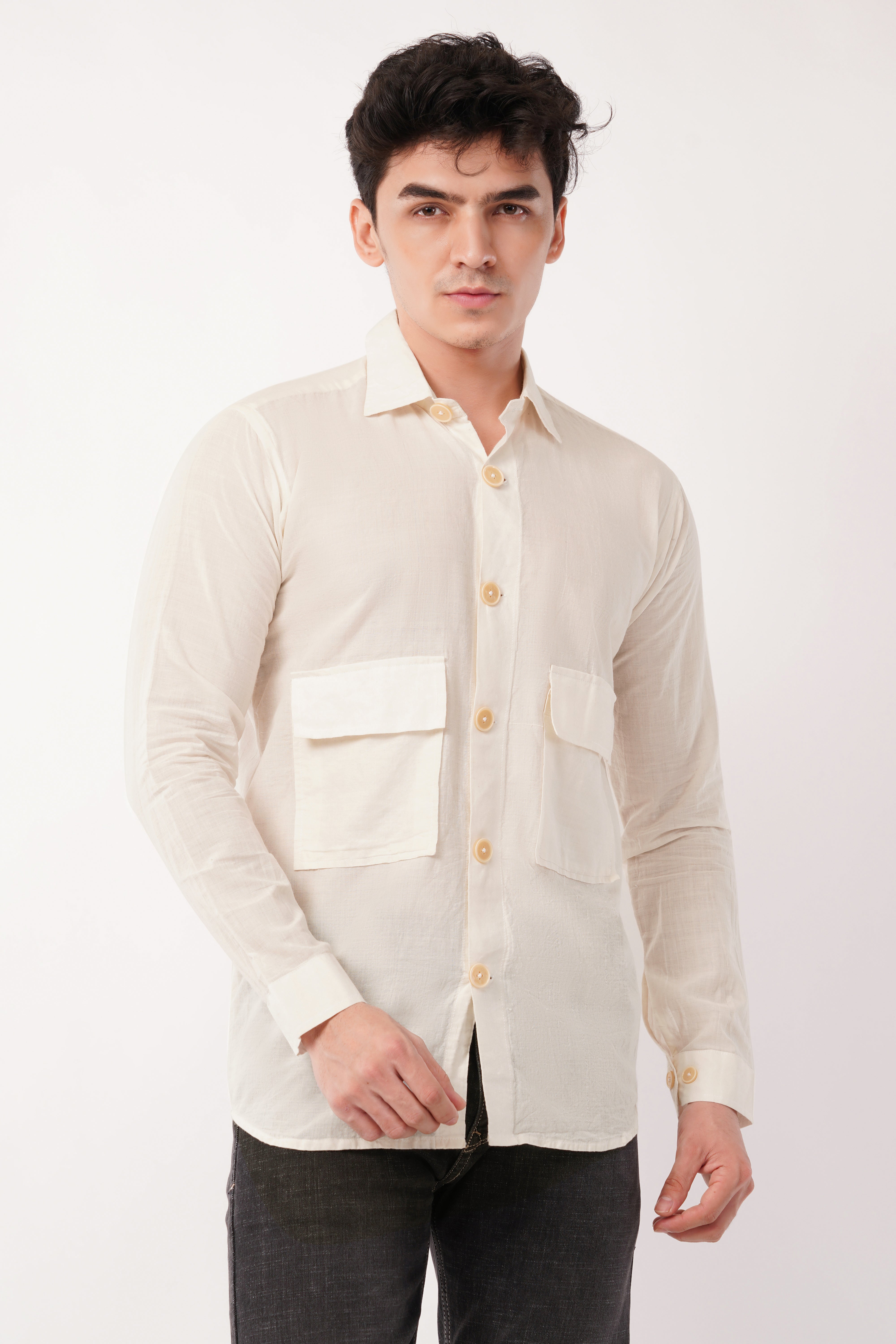 Whether you're building a capsule wardrobe or upgrading your weekend look, the Double-Pocket Off-White Full-Sleeves Shirt gives you that sharp, “quiet-luxury” edge without overthinking.